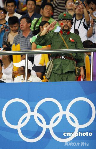 8月13日,北京奧運(yùn)會男子足球賽,中國對巴西的比賽在秦皇島奧體中心舉行,最終中國隊(duì)0:3負(fù)于巴西隊(duì)。圖為一位身著老式“軍裝”的球迷亮相秦皇島奧體中心。 中新社發(fā) 劉新 攝