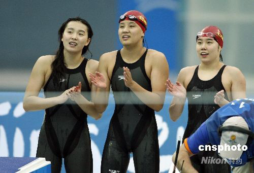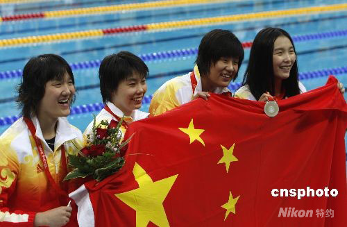 8月14日11時(shí),北京奧運(yùn)會(huì)女子4x200米自由泳接力決賽在國家游泳中心水立方舉行,由朱穎文、徐妍瑋、楊雨、龐佳穎組成的中國隊(duì),以7分45秒93的成績(jī)戰(zhàn)勝美國隊(duì),為中國泳團(tuán)再添一枚銀牌。澳大利亞女隊(duì)以7分44秒31打破世界紀(jì)錄獲得金牌。美國隊(duì)獲得第三,成績(jī)是7分46秒33。 中新社發(fā) 杜洋 攝