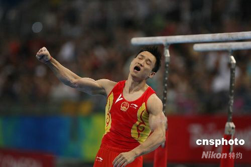 8月14日,中國(guó)奧運(yùn)“三朝元老”楊威在北京奧運(yùn)會(huì)體操男子個(gè)人全能決賽中力壓群雄,以94.575分,高出亞軍2.6分的較大優(yōu)勢(shì),奪得這塊體操個(gè)人項(xiàng)目中分量最重的金牌,他也成為繼李小雙之后中國(guó)體操的第二位個(gè)人全能奧運(yùn)冠軍。中新社發(fā) 武仲林 攝