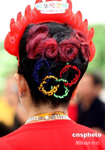 8月14日,青島奧運(yùn)帆船賽場(chǎng),熱情觀眾在展示頭帶五環(huán)的發(fā)髻。中新社發(fā) 趙振清 攝