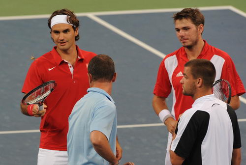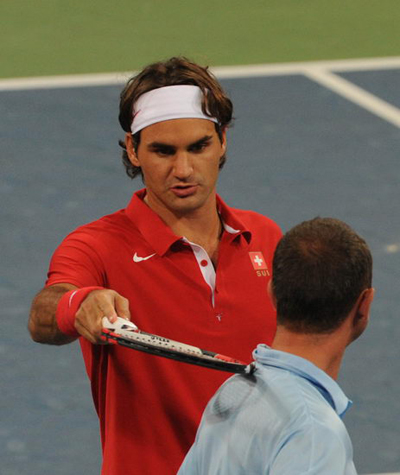 奧運(yùn)賽場花許多,在網(wǎng)球男雙第二輪比賽前,一只螞蚱飛到了裁判的后背上,“天王”費德勒用球拍趕走了螞蚱。新華社記者邢廣利攝