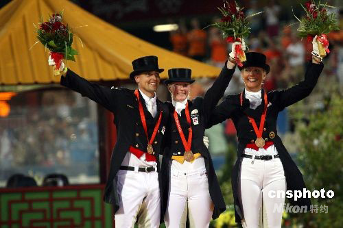 八月十四日晚,在香港沙田奧運(yùn)馬術(shù)主賽場上,丹麥隊獲得奧運(yùn)馬術(shù)盛裝舞步團(tuán)體賽銅牌。中新社發(fā) 洪少葵 攝