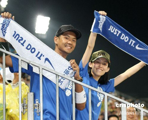 8月14日晚,在北京五棵松棒球場進(jìn)行的中華臺北對日本之戰(zhàn)吸引了眾多臺灣球迷的目光。臺灣當(dāng)紅藝人陳建州(左)和范瑋琪(右)專程到場為中華臺北隊(duì)加油。 中新社發(fā) CNAsports 攝