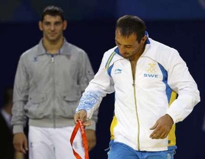 中新網(wǎng)8月15日電 綜合報道,8月14日在北京奧運(yùn)會男子古典式摔跤84公斤級決賽中,意大利選手安德烈亞·明古齊最終奪冠。他在頒獎儀式上興奮地親吻禮儀小姐。而來自瑞典的男子古典式摔跤運(yùn)動員阿布拉哈米安沖金失敗,因不滿比賽結(jié)果而怒摔銅牌。