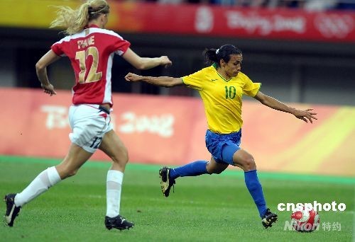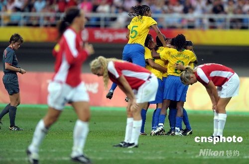 8月15日,奧運(yùn)女足四分之一決賽在天津奧體中心水滴體育場(chǎng)舉行,巴西隊(duì)2-1擊敗挪威,率先進(jìn)入半決賽。本場(chǎng)比賽,巴西隊(duì)由達(dá)妮埃拉和瑪塔先入兩球,挪威隊(duì)則由西麗·努爾比通過(guò)點(diǎn)球扳回一分,但最終無(wú)力挽回?cái)【帧?