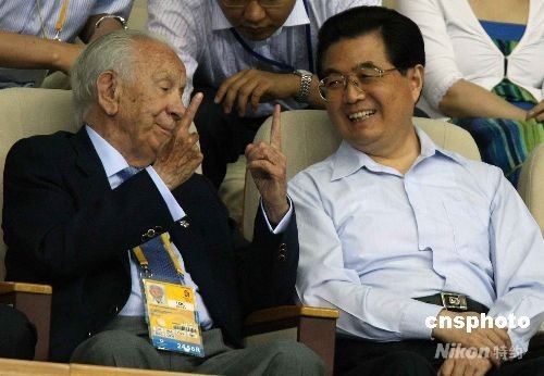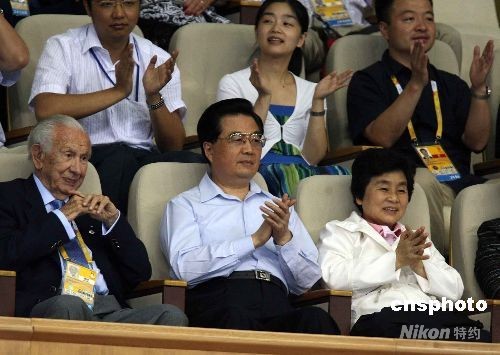 8月15日晚,胡錦濤夫婦與國際奧委會終身名譽(yù)主席薩馬蘭奇等到北京首都體育館,觀看北京奧運(yùn)會中國與美國女排比賽。中新社發(fā) 任晨鳴 攝