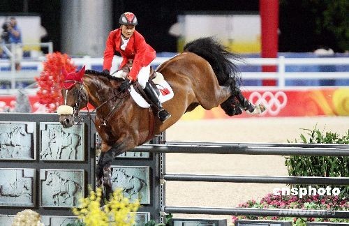 八月十五日晚,在香港沙田主場館進(jìn)行的奧運(yùn)馬術(shù)場地障礙個人賽上,中國選手李振強(qiáng)策馬飛躍障礙。當(dāng)日,中國馬術(shù)代表隊(duì)四名選手首度亮相,參加場地障礙賽個人賽第一輪資格賽。中新社發(fā) 洪少葵 攝