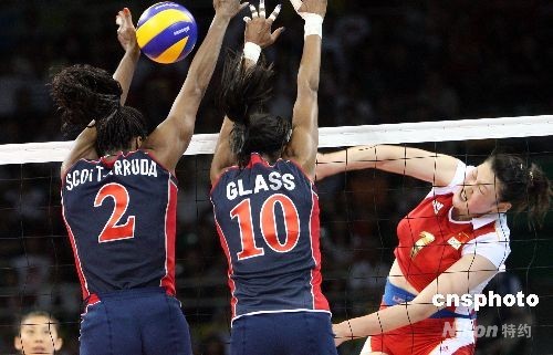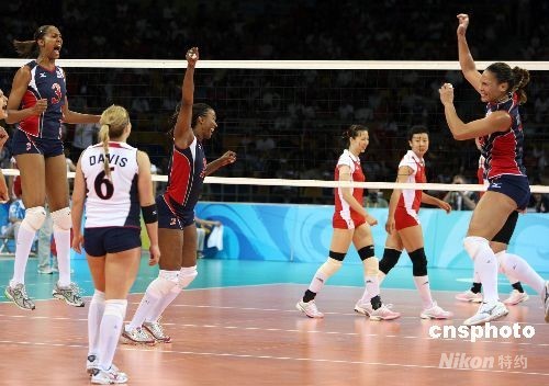 8月15日晚,北京奧運(yùn)會(huì)女排小組賽中國與美國之戰(zhàn)在北京奧運(yùn)會(huì)排球比賽館--首都體育館舉行,這場(chǎng)被戲稱為“和平大戰(zhàn)”的比賽最后時(shí)刻,兩名美國選手封死了中國隊(duì)王一梅的扣殺而以3比2戰(zhàn)勝中國女排。中新社發(fā) 任晨鳴 攝