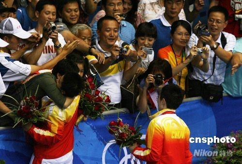 8月15日晚,中國(guó)組合杜婧、于洋在北京奧運(yùn)會(huì)羽毛球女子雙打決賽中以2比0戰(zhàn)勝韓國(guó)組合李孝貞、李敬元,奪得金牌。圖為杜婧、于洋與觀眾互動(dòng)。中新社發(fā) 武仲林 攝