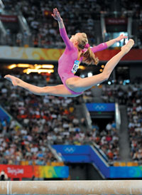 昨天中午,國家體育館中,女子體操全能決賽的最后一個項目是自由體操,美國選手柳金倒數(shù)第二個出場,這位19歲女孩有著高挑的身材和柔美的氣質(zhì)。隨著一曲充滿俄羅斯風(fēng)情的《黑眼睛》,身著粉衣的柳金開始了技驚四座的表演,只見她以一串又高又飄的跟頭精彩亮相,而后柳金憑借優(yōu)雅舒展的舞蹈和流暢而富有張力的動作贏得了觀眾雷鳴般的掌聲,最后當(dāng)她以輕輕的踢腿動作在場地上定格時,全場沸騰了。盡管最后一名隊員肖恩還沒有上場,但如此精彩的演出足以讓她得到金牌。