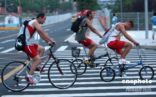 北京2008奧運(yùn)會(huì)青島分賽場(chǎng)的奧帆村居住著來(lái)自世界各地的400多名運(yùn)動(dòng)員,許多運(yùn)動(dòng)員在比賽之前選擇自行車(chē)運(yùn)動(dòng)為賽前的準(zhǔn)備活動(dòng),“自行車(chē)比賽”場(chǎng)景經(jīng)?梢(jiàn)。中新社發(fā) 趙振清 攝