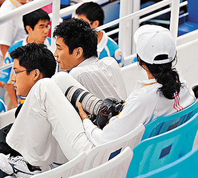 報(bào)道說,郭晶晶在第三跳前,霍啟剛才于水立方的觀眾席現(xiàn)身,相隔約一、兩分鐘后,朱玲玲和霍啟山也到場(chǎng),三人并肩而坐。霍啟剛被全場(chǎng)記者舉機(jī)狂影,表現(xiàn)甚不自然,反而帶備Canon專業(yè)相機(jī)及長(zhǎng)鏡的朱玲玲則投入其攝影世界,每逢郭晶晶和吳敏霞出場(chǎng),她都即時(shí)舉機(jī)拍照。