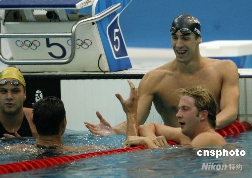 各國選手紛紛祝賀菲爾普斯創(chuàng)造的7金紀(jì)錄。
