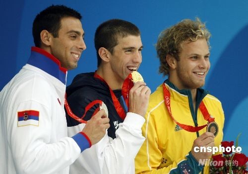 圖為美國選手邁·菲爾普斯(中)、塞爾維亞選手米洛拉德·查維奇(左)和澳大利亞選手安·勞特斯滕在男子100米蝶泳頒獎儀式上,他們分別獲得這個項目的金銀銅牌。