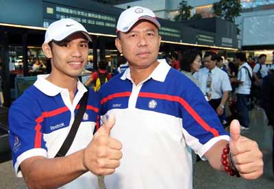 中華臺北奧運跆拳道代表隊選手宋玉麒(左)出發(fā)時候在桃園機場表示,身為本次中華臺北代表隊教練的父親宋景宏,是他參賽的最大附身符。圖為父子倆出征奧運時候在機場向送行者亮出大拇指。(上圖)