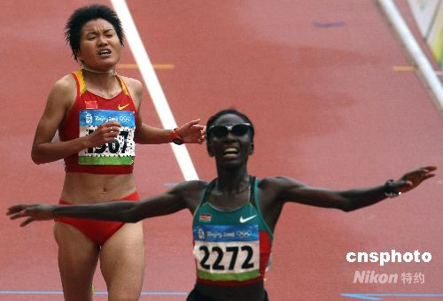 8月17日,在北京奧運(yùn)會(huì)女子馬拉松決賽中,中國(guó)選手周春秀(右)以二小時(shí)二十七分零七秒的成績(jī)奪得銅牌;另一名中國(guó)選手朱曉琳獲得第四名。