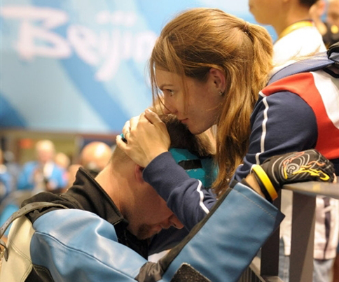 失落的埃蒙斯走到妻子的面前,這位射落本屆奧運(yùn)會(huì)首金的捷克女神槍手,捧起丈夫的臉,輕輕地摩挲,用深情的注視和呢喃來安慰他……,就像卡特琳娜奪金之后與丈夫深情一吻一樣,這一刻也給觀眾留下了深刻而溫馨的印象。