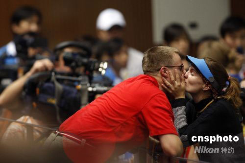 此圖為奧運(yùn)會(huì)開(kāi)賽首日卡特琳娜射落首金后,丈夫埃蒙斯送吻慶祝。
