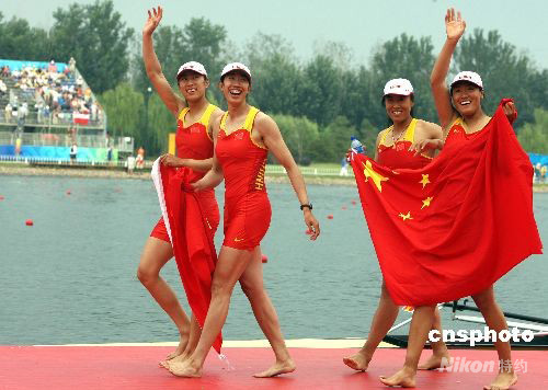 中國(guó)組合唐賓、金紫薇、奚愛華、張楊楊在北京奧運(yùn)會(huì)賽艇女子四人雙槳決賽中以6分15秒95的成績(jī)超越英國(guó)、德國(guó)等世界名將獲得冠軍,取得了歷史性的突破。