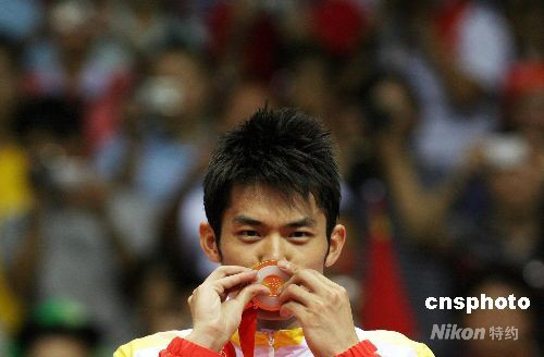 8月17日晚,中國選手林丹在北京奧運(yùn)會羽毛球男單決賽中以2:0 戰(zhàn)勝馬來西亞選手李宗偉,奪得冠軍,終圓奧運(yùn)冠軍夢。 中新社發(fā) 武仲林 攝