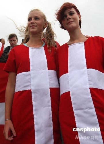 身著國(guó)旗圖案服裝的丹麥美女拉拉隊(duì)現(xiàn)場(chǎng)格外引人注目。中新社發(fā) 趙振清 攝