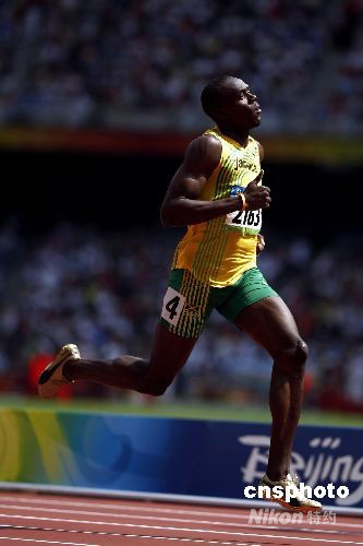 8月18日,北京奧運(yùn)會(huì)男子200米預(yù)賽在北京國家體育場“鳥巢”舉行,剛拿到奧運(yùn)百米冠軍的牙買加選手博爾特輕松晉級下一輪比賽。 中新社發(fā) 盛佳鵬 攝