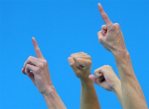 菲爾普斯和他的隊友們在4×200米自由泳接力摘金后慶祝。
