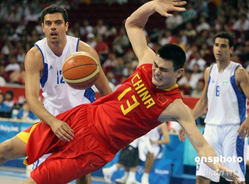 北京奧運會男子籃球小組賽第五輪比賽8月18日在五棵松籃球館舉行,由姚明統(tǒng)率的中國隊與世界勁旅希臘隊為八強位置展開激戰(zhàn),最終,實力不足的中國隊以77比91告負;雖然姚明砍下全隊最高的16分,但對全局無濟于事。 中新社發(fā) 任晨鳴 攝