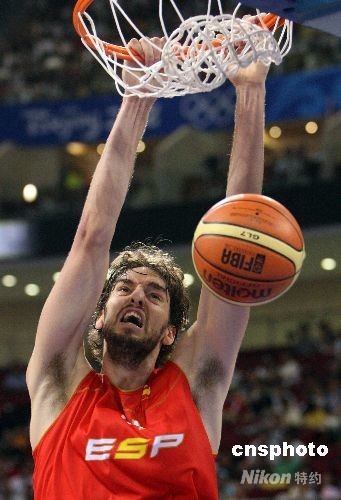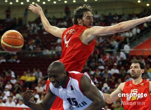 北京奧運(yùn)會男籃小組賽最后一輪賽事8月18日在北京五棵松籃球館舉行,此前三勝一負(fù)的世錦賽冠軍西班牙隊(duì)以98比50擊敗非洲冠軍安哥拉;安哥拉隊(duì)五戰(zhàn)五負(fù),小組墊底。西班牙的超級巨星保羅·加索爾僅僅上場23分鐘,不僅砍下全場最高的31分,而且嚴(yán)密的防守讓對手往往無功而返,充分體現(xiàn)了“領(lǐng)袖氣質(zhì)”。中新社發(fā) 任晨鳴 攝