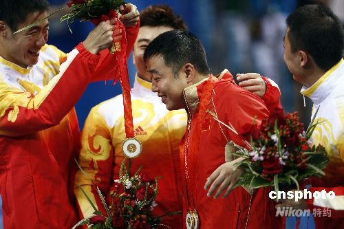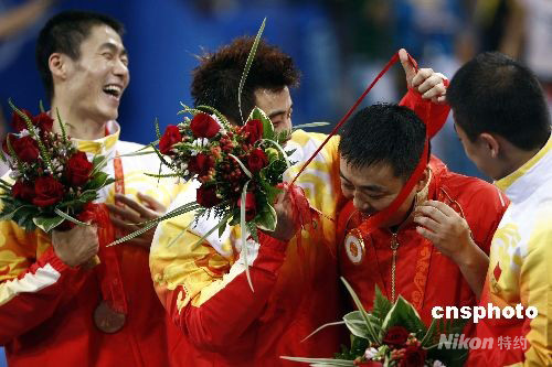 8月18日,2008年北京奧運(yùn)會(huì)乒乓球男團(tuán)決賽中國(guó)隊(duì)與德國(guó)隊(duì)的較量在北京大學(xué)體育館展開(kāi),中國(guó)隊(duì)?wèi){借出色的表現(xiàn),以3比0擊敗德國(guó)隊(duì)奪冠。圖為領(lǐng)獎(jiǎng)臺(tái)上,王皓、王勵(lì)勤、馬琳將三塊金牌都?xì)w功于教練劉國(guó)梁。
