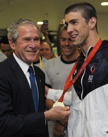 美國總統(tǒng)布什接見菲爾普斯時喜笑顏開。