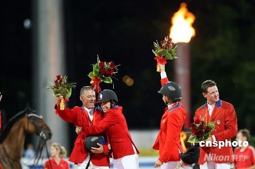 八月十八日晚,美國隊獲得奧運(yùn)馬術(shù)場地障礙賽團(tuán)體金牌,笑逐顏開登上領(lǐng)獎臺。當(dāng)日,奧運(yùn)馬術(shù)比賽在香港沙田進(jìn)行場地障礙賽團(tuán)體決賽,決出奧馬第四塊金牌。中新社發(fā) 洪少葵 攝