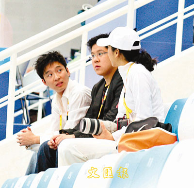 媒體曾在水立方發(fā)現(xiàn)朱玲玲(右)、霍啟剛(中)和霍啟仁觀看晶晶比賽。