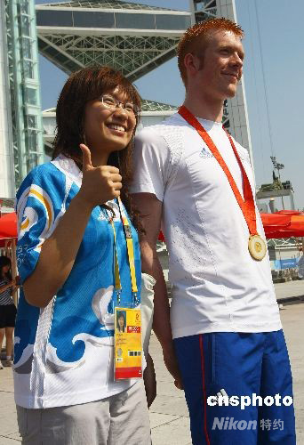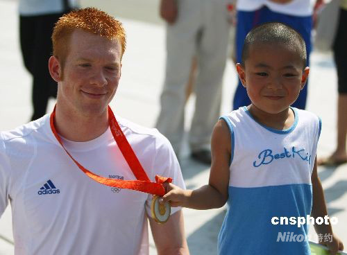 8月19日,獲得北京奧運(yùn)會(huì)自行車團(tuán)體追逐賽冠軍的英國自行車運(yùn)動(dòng)員在奧林匹克公園內(nèi)接受媒體采訪,大批觀眾、游客和志愿者紛紛上前與其合影。而英國自行車運(yùn)動(dòng)員也依然沉浸在獲得金牌的喜悅中,做起了“模特”。 中新社發(fā) 劉新 攝