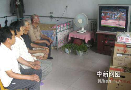 宋愛民鄉(xiāng)鄰正在她家觀看奧運比賽(中間2人是她的父母)。崔志平 攝