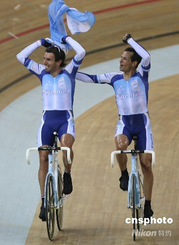 8月19日,阿根廷隊(duì)在北京奧運(yùn)會(huì)場(chǎng)地自行車(chē)麥迪遜賽上奪得金牌。 中新社發(fā) 武仲林 攝