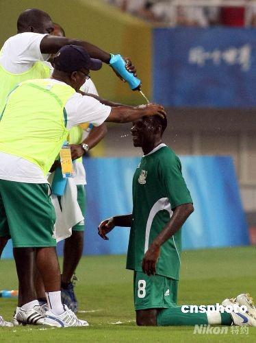 8月19日,北京奧運(yùn)會(huì)男足半決賽,尼日利亞以4:1大勝比利時(shí),晉級奧運(yùn)男足決賽。圖為尼日利亞球員用“洗頭”的方式來慶祝勝利。中新社發(fā) 湯彥俊 攝