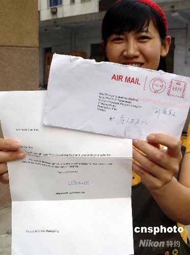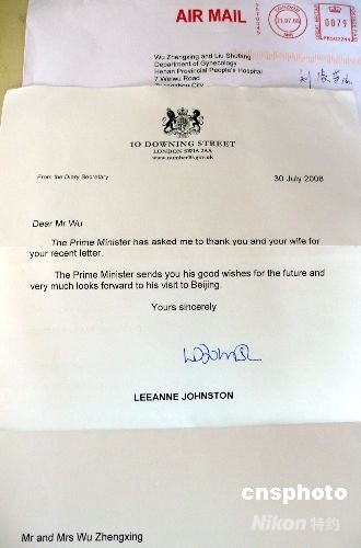 八月十九日,劉淑芳女士在展示英國首相布朗通過秘書發(fā)給其夫婦二人的信函。當日,一封發(fā)自英國倫敦唐寧街十號的信函飛到河南省會鄭州,落到中國第一對擔任過都靈冬奧會的“情侶火炬手”——吳振星、劉淑芳夫婦手中。英國首相布朗通過秘書表示說,自己對北京之行充滿期待。據了解,在七月初,這對夫妻曾通過信函的方式,分別給美國總統(tǒng)布什、英國首相布朗、法國總統(tǒng)薩科齊等寫信,誠邀三國元首參加北京奧運會,并到少林寺實地體驗中國功夫。 中新社發(fā) 李志全 攝