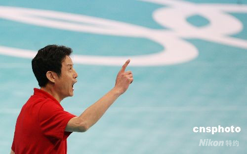 圖為中國(guó)女排主教練陳忠和在場(chǎng)邊督戰(zhàn)激情洋溢。