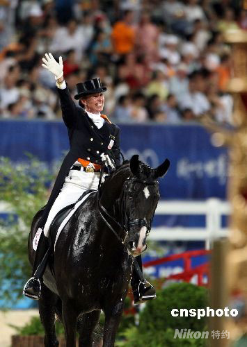 八月十九日晚,荷蘭選手安基·范格林斯芬駕坐騎“薩林雷羅”,在香港沙田奧運(yùn)馬術(shù)盛裝舞步個(gè)人賽(大獎(jiǎng)賽自選動(dòng)作)上,技?jí)喝盒,獲得金牌。 中新社發(fā) 洪少葵 攝