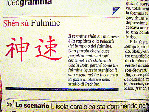 這個(gè)“漢字”專欄自北京奧運(yùn)會(huì)開幕之日起,每天一期、每期一詞,每個(gè)詞都標(biāo)注拼音,引出一段新聞。如8月8日的專欄詞匯是“鳥巢”,在這兩個(gè)漢字下面用意大利語解釋了“鳥巢”在漢語中的本意,介紹了北京的國家體育場,并配上焰火照耀下的“鳥巢”夜景圖片。其后的專欄相繼刊登了“文身”、“興奮劑”、“球門”、“地區(qū)”、“神速”等漢語詞匯。在漢字“興奮劑”下報(bào)道的新聞是:奧組委為實(shí)現(xiàn)“干凈的奧運(yùn)會(huì)”已向興奮劑宣戰(zhàn),北京設(shè)立了由220名高級(jí)專家組成的超級(jí)檢測中心,每天檢測數(shù)量達(dá)250例!吧袼佟币辉~解讀的新聞是:這個(gè)在漢語中意為閃電般快速的詞,恰如其分地描繪了飛人博爾特17日晚破百米紀(jì)錄的情景。這名身高196cm的運(yùn)動(dòng)員,以其閃電般的速度征服了北京國家體育場內(nèi)的所有觀眾。(記者穆方順)