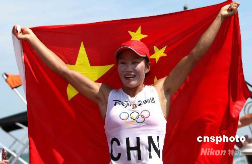 8月20日,北京2008奧運(yùn)帆板比賽在青島分賽場(chǎng)舉行,中國(guó)四川姑娘殷劍奪得女子帆板冠軍,這也是中國(guó)代表團(tuán)在奧運(yùn)會(huì)歷史上取得的第一枚帆船項(xiàng)目的金牌。中新社發(fā) 趙振清 攝