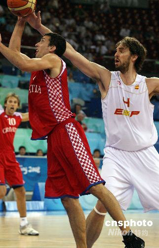8月20日,北京奧運(yùn)會(huì)男子籃球八進(jìn)四淘汰賽在五棵松籃球館開戰(zhàn),2006年世錦賽冠軍西班牙隊(duì)在球星保羅·加索爾的率領(lǐng)下,以72比59戰(zhàn)勝歐洲勁旅克羅地亞隊(duì)。保羅·加索爾(白)上場26分鐘,砍下全場最高的20分。中新社發(fā) 任晨鳴 攝