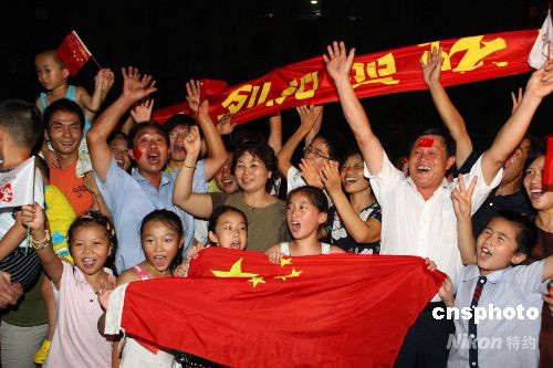 8月19日,江蘇常州市,陸春龍的父親陸建平(右三,臉上有國旗者)、母親倪如英(右六)和所住小區(qū)里的居民為陸春龍贏得北京奧運(yùn)會男子蹦床金牌歡呼。中新社發(fā) 胡平 攝