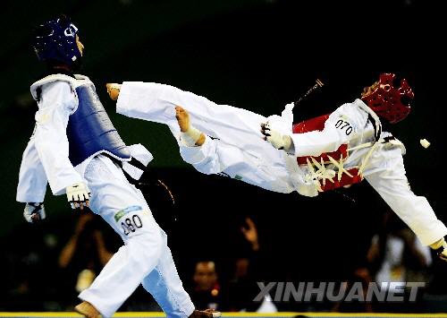 8月20日,中華臺(tái)北選手朱木炎(左)在北京奧運(yùn)會(huì)跆拳道男子58公斤級(jí)四分之一決賽中以2比3不敵多米尼加選手梅塞德斯。 新華社記者鄒崢攝