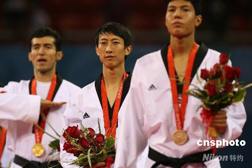 8月20日,中華臺(tái)北選手朱木炎獲得北京奧運(yùn)會(huì)跆拳道男子58公斤以下級(jí)銅牌。中新社發(fā) 武仲林 攝