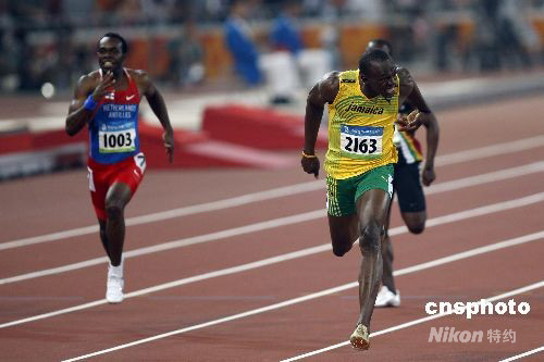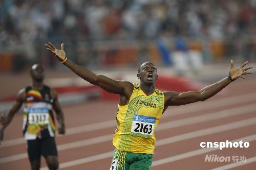 8月20日晚,國家體育場舉行的北京奧運(yùn)會男子200米決賽中,牙買加選手尤塞恩·博爾特以19.30創(chuàng)造新的世界紀(jì)錄并獲得金牌。這是他在本屆奧運(yùn)會上繼百米金牌后奪得的第二枚金牌。 中新社發(fā) 盛佳鵬 攝