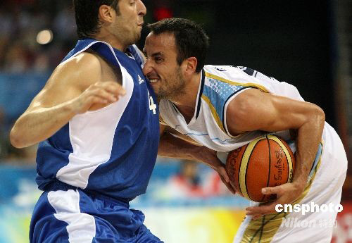 北京奧運會男籃最后一場八進四比賽,8月20日午夜時分在五棵松籃球館舉行,南美洲冠軍、雅典奧運會冠軍阿根廷隊以80比78驚險戰(zhàn)勝歐洲勁旅希臘隊,進入前四名。阿根廷隊將與美國“夢八隊”爭奪決賽權(quán)。隊中“老大”、在NBA馬刺隊效力的球星吉諾比利不僅砍下全場最高的24分,而且在最后時刻投中關(guān)鍵一球;另一名球星10號德爾菲諾(DELFINO Carios Francisco)砍下23分。中新社發(fā) 任晨鳴 攝