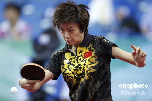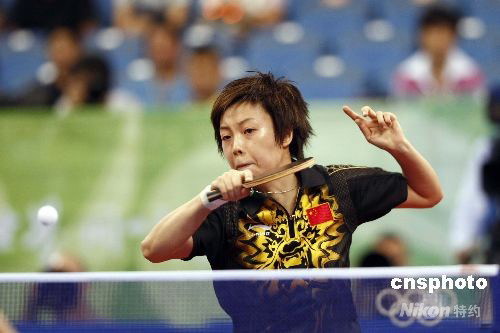 8月21日,北京奧運(yùn)會(huì)乒乓球女子單打第四輪的比賽在北京大學(xué)體育館進(jìn)行,中國(guó)選手張怡寧4比1戰(zhàn)勝日本選手福原愛(ài)晉級(jí)下一輪比賽。中新社發(fā) 盛佳鵬 攝