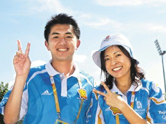 來(lái)自臺(tái)灣的七十四名志愿者,在五棵松棒球場(chǎng)上有近20人,他們多半負(fù)責(zé)球場(chǎng)上觀眾導(dǎo)引、維持一般秩序等工作。